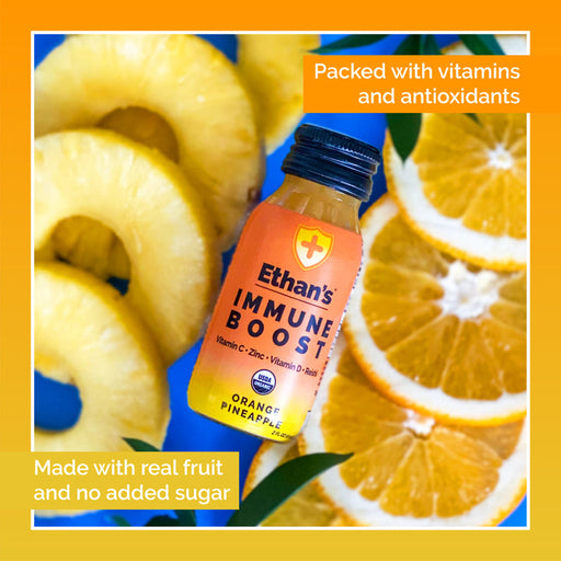 ETHAN'SOut of stockORANGE PINEAPPLE IMMUNE BOOST SHOTS deliver bright and tangy organic deliciousness that will keep your immune system strong. FEEL BETTER with a boo...